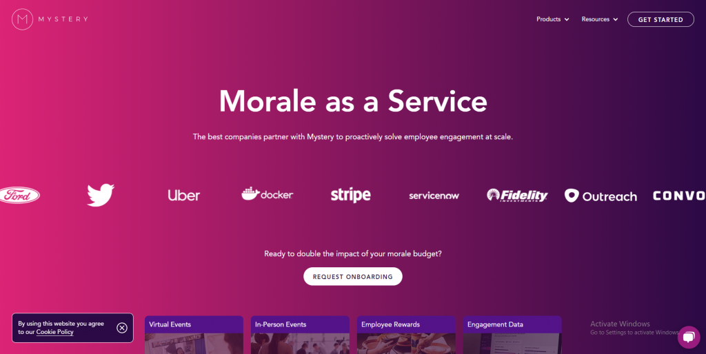 Tampilan website Mystery didesain dengan tema warna gradasi ungu, menampilkan logo-logo brand terkenal yang bekerja sama dengan Mystery dengan maksud membangun kepercayaan kepada customer (splunk, Amazon, Microsoft, Apple, Starbucks, Ford, dan Twitter) yang ditampilkan dengan mode bergerak, dilengkapi fitur live chat, pemilihan font yang rapi dan mudah dibaca, template yang sederhana tapi terlihat elegan.