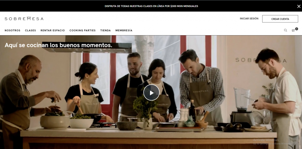 Sobremesa menggunakan video singkat pada header tampilan websitenya. Pada tampilan beranda dipenuhi dengan foto-foto sebagai tampilan visualnya, kata-kata singkat “pengalaman kami”, label blog yang memudahkan penggunanya untuk menemukan sebuah konten yang mereka cari, dan fitur daftar keranjang yang akan memudahkan pembeli untuk membayar.