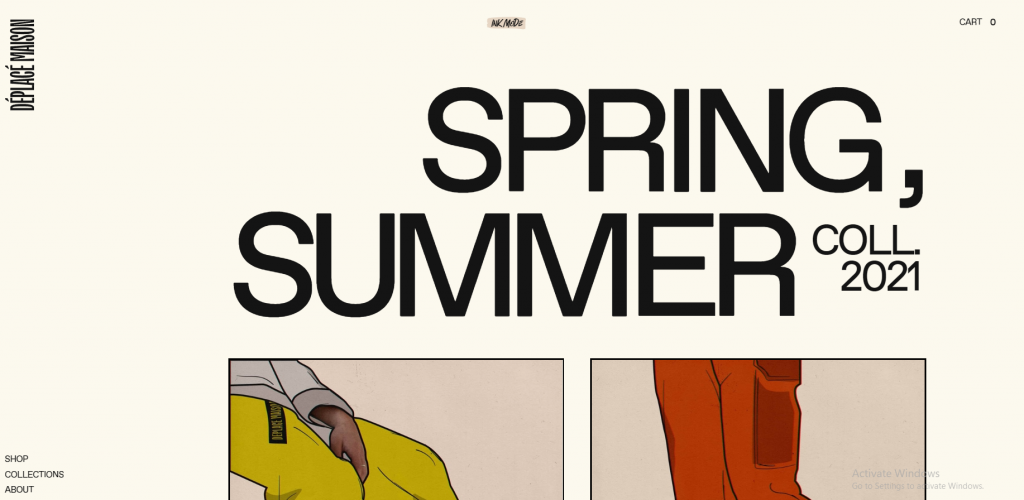 Website Déplace Maison dirancang dengan sebuah gambar desain grafis pada header mereka yang sangat mencerminkan ciri khas produknya, font yang besar diketik dengan capslock, dan juga menghias kursor dengan icon yang menyerupai tinta hitam yang bergerak. Saat kamu pertama kali masuk ke dalam situs website mereka, tampil sebuah tulisan bergerak yang berkesan menakjubkan.
